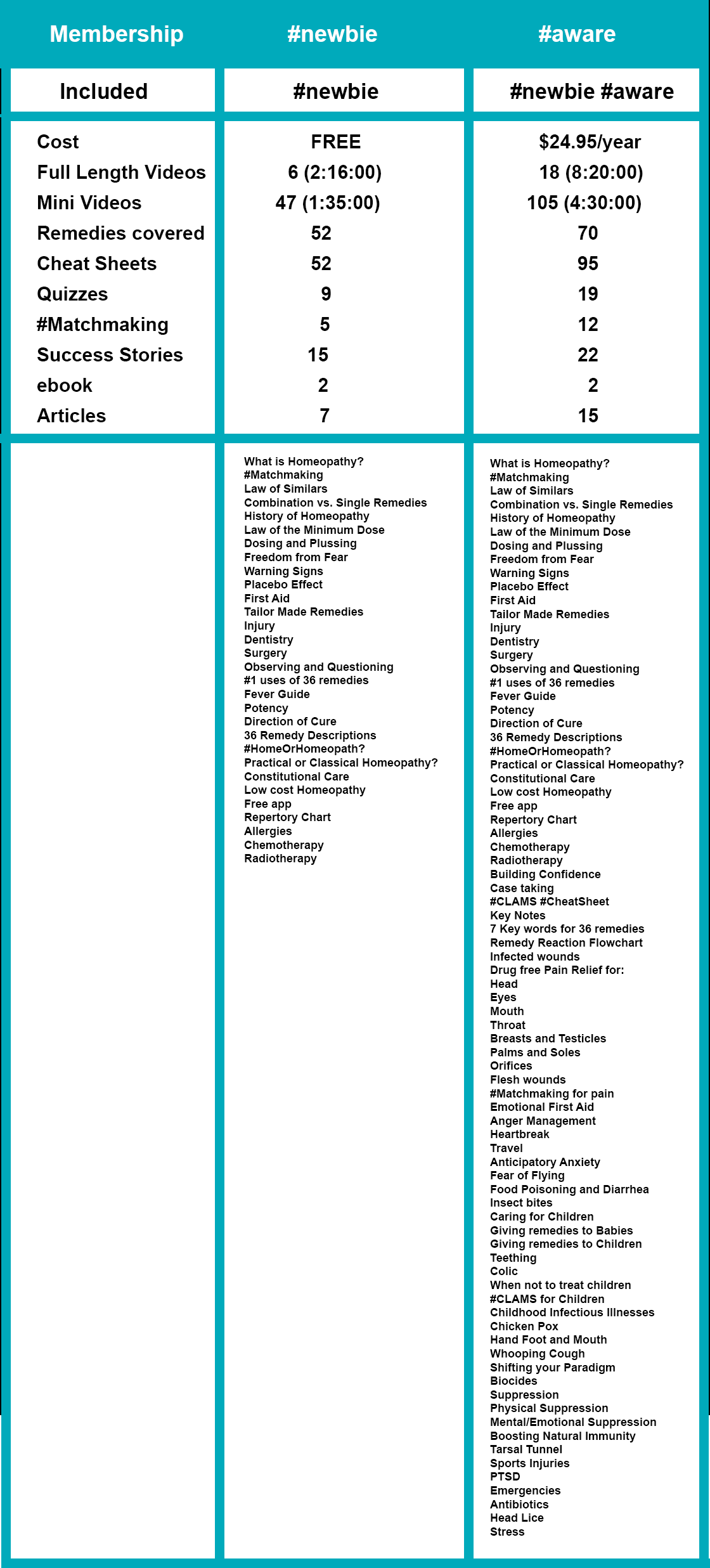 Currently Mary offers two membership levels. Both have videos, helpful summaries, infographics, quizzes and #Matchmaking practice exercises. In her #newbie membership you'll learn the #1 uses of 36 remedies, first aid remedies for injuries, dentistry, surgery and emotional first aid. In her #aware membership she guides you deeper into homeopathy, particularly for children. She explores remedy reactions, acute illnesses, heartbreak, anger management, biocides, suppression and boosting immunity.